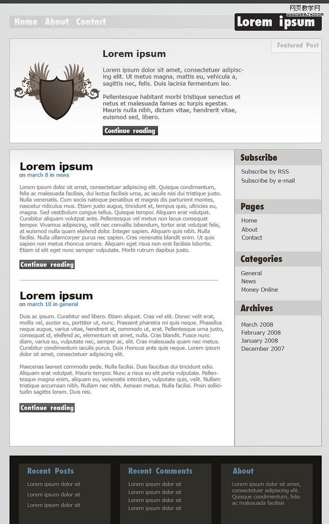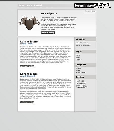 使用photoshop或者是fireworks等制圖工具將網(wǎng)站的效果圖設(shè)計(jì)出來(lái),需要具備掌握設(shè)計(jì)軟件操作,色彩搭配,等基本功。下圖是利用photoshop制作的簡(jiǎn)潔型網(wǎng)站模版。