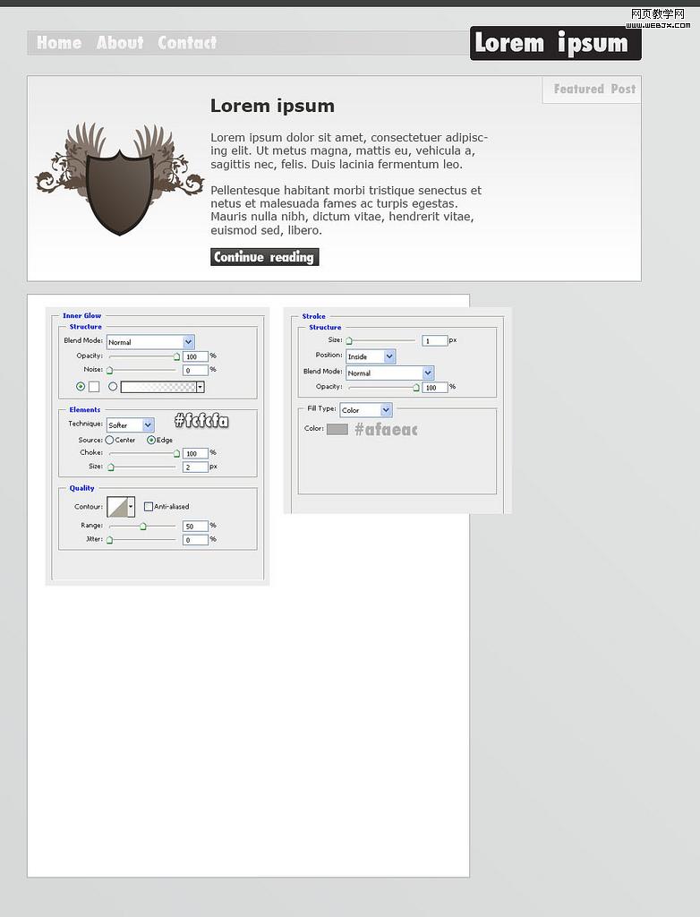 8)now we are going to create a ‘continue reading’ button. make a rectangular selection, fill it with any color, open the layer style window and use the settings from the next image. write continue reading above the button.