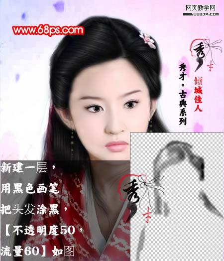 2、新建一個圖層,用黑色畫筆把頭發涂黑,畫筆設置:不透明度:50%,流量:60。