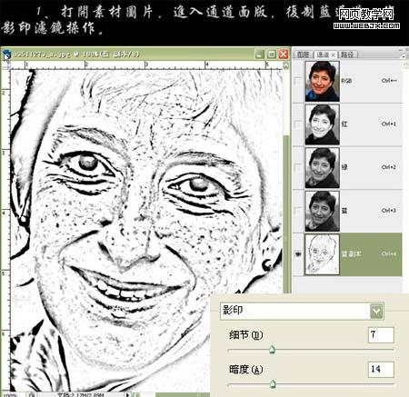 1、打開素材圖片,進入通道面板,把藍色通道復制一份,然后對藍色通道副本執行:濾鏡 > 素描 > 影印,參數設置如下圖。