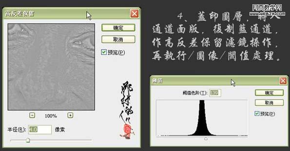 4、新建一個圖層,按ctrl + alt + shift + e蓋印圖層,進入通道面板,把藍色通道復制一層,對藍色副本通道執行:濾鏡 > 其它 > 高反差保留,參數設置如下圖左,確定后再執行:圖像 > 調整 > 閾值,參數及效果如下圖。