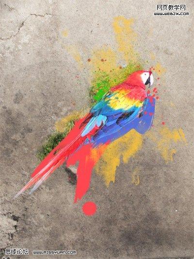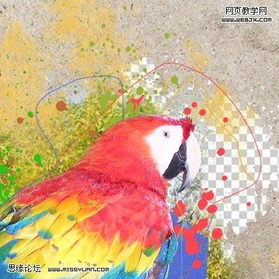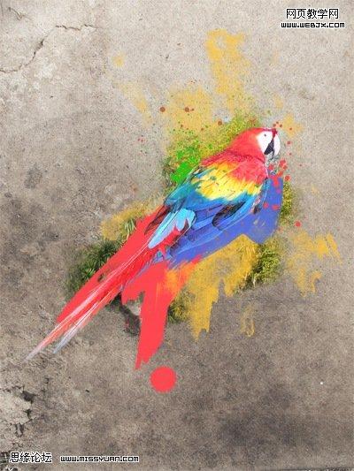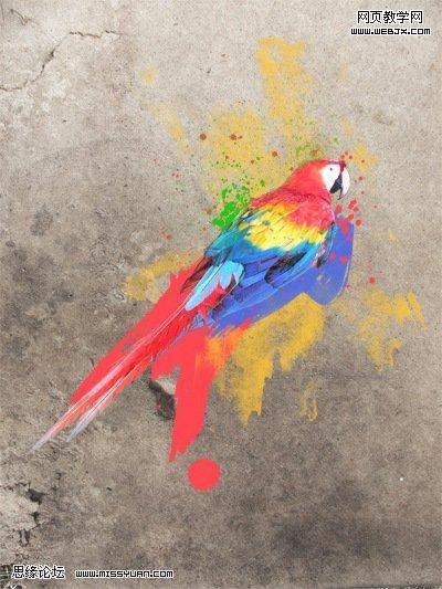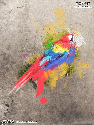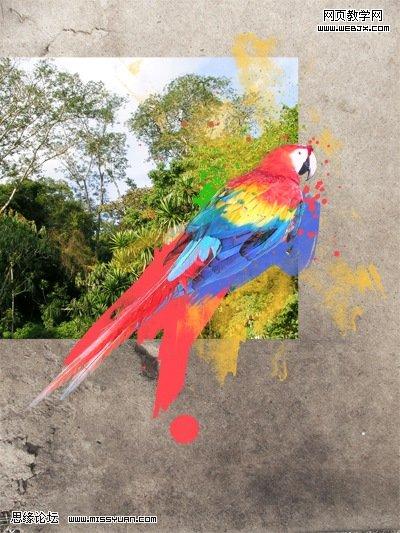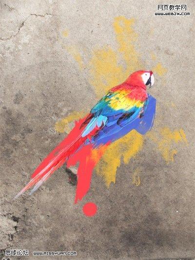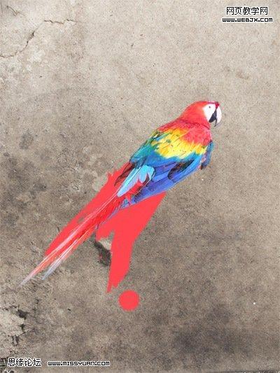 在鸚鵡圖層下面新建一個層,用圖案圖章工具,選好圖案,用飛濺筆刷或水彩筆刷在此圖層上蓋印。