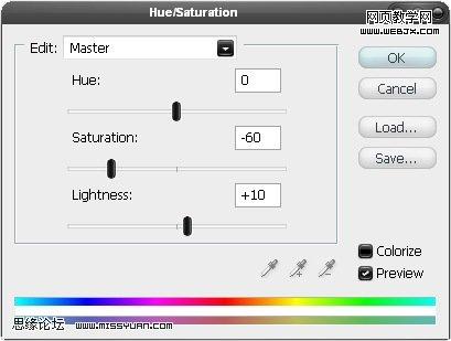2、在圖層面板創建一個新的色相/飽和度調整層,設置如下所示: