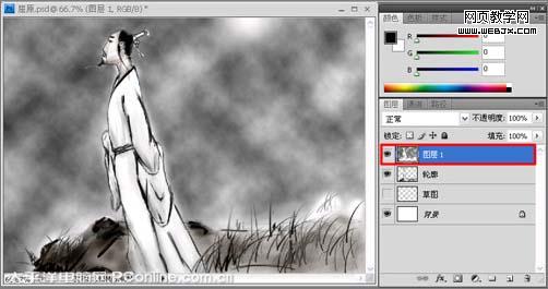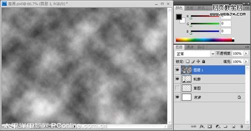 <圖11> 12、按鍵盤上的d鍵把前景色和背景色還原為默認(rèn)的顏色手,按組合鍵ctrl+shift+n新建“圖層1”,執(zhí)行菜單:“濾鏡”/“渲染”/“云彩”,給圖導(dǎo)添加云彩濾鏡,如圖12所示。