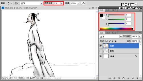 7、調(diào)整設(shè)置前景色rgb值,將畫筆不透明度設(shè)置為7%~9%,利用畫筆涂畫人物臉部顏色,對深色部分進(jìn)行反復(fù)涂抹,前額頭發(fā)進(jìn)行調(diào)整,如圖7所示。