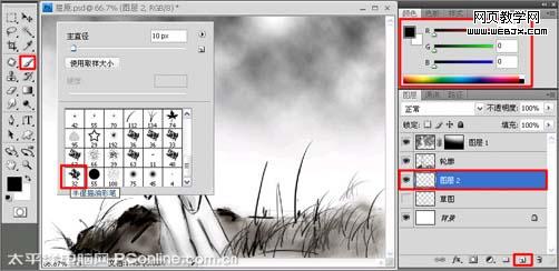 <圖8> 9、設(shè)置畫筆的不透明度為:100%,選擇畫筆筆尖樣式為“沙丘草”,利用畫筆在巖石上面畫出雜草,如圖9所示。