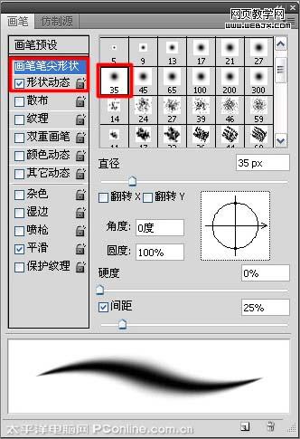 <圖4> 5、選擇工具箱中的畫筆工具后,按鍵盤上的f5鍵,彈出畫筆預(yù)設(shè)面板,在“畫筆筆尖形狀”選擇中選擇柔角35像素筆尖,然后勾選“形狀動(dòng)態(tài)”選項(xiàng),如圖5所示。