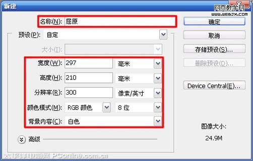 | 1、打開photoshop cs4軟件,執(zhí)行菜單:“文件”/“新建”(快捷鍵ctrl+n),彈出新建文件窗口,命名文件為:屈原,文件的大小與分辨率等的設(shè)置如圖1所示。 |