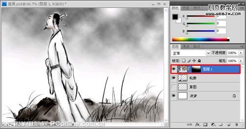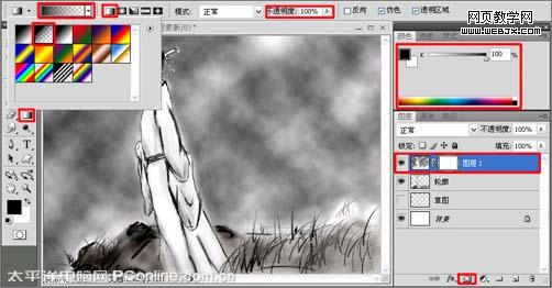 15、單擊圖層面板下方的添加圖層蒙板按鈕,給“圖層1”添加圖層蒙板,選擇工具箱中的漸變工具,在工具選項(xiàng)欄上選擇漸變?yōu)閺那熬吧酵该鳚u變樣式,選擇漸變類型為線性漸變,不透明度設(shè)置為:100%,然后在顏色面板中調(diào)整漸變顏色,如圖15所示。