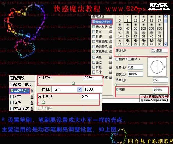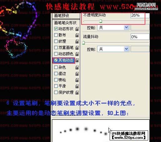 6、設(shè)置筆刷,筆刷要設(shè)置成大小不一樣的光點(diǎn),主要運(yùn)用的是動態(tài)筆刷來調(diào)整設(shè)置,如圖:
