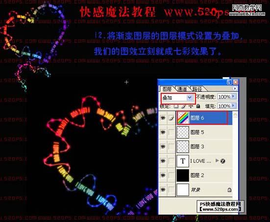 12、將漸變圖層的圖層模式設(shè)置為疊加,我們的圖效立刻就成七彩效果了。