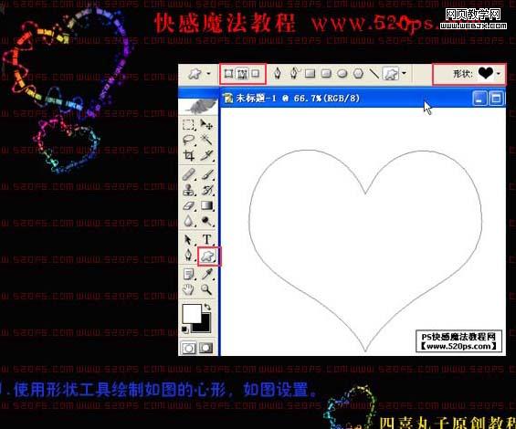 | 1、新建一個600 * 500像素的文件,使用ps形狀工具繪制如圖的心形,按住shift鍵可以繪制比較飽滿的心形,如圖設(shè)置。 |