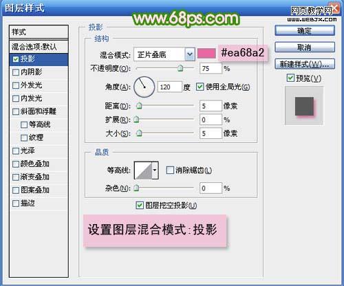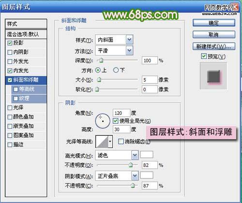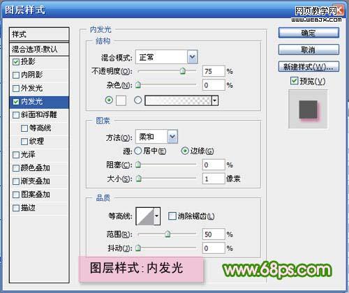 2、輸入文字,如圖1。然后給文字設置圖層樣式。(在文字圖層上,單擊鼠標右鍵,選擇混合選項,彈出圖層樣式的對話框),參數設置如圖3-6。