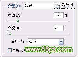 | 1、制作背景:新建一個454x340的文件。設置前景色的顏色值為#89c997,背景色的顏色值為#009944。在背景層上方新建一層。選擇漸變工具,漸變類型選擇線性漸變,從上往下拉一條漸變。濾鏡-紋理-紋理化,紋理選擇砂巖,縮放75%,凸現:2;光照:右下,不用勾選反相。如圖1。 |