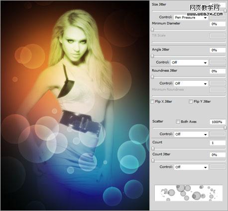 11、重復(fù)步驟 8、9,創(chuàng)建比之前定義筆刷稍大的筆刷。采用同步驟 10相同的設(shè)置繪制較大的透明圓。雙擊圓形圖層打開圖層混合樣式窗口,選擇漸變疊加并設(shè)置漸變條。
