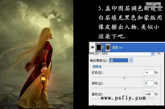 5、創建通道混合器調整圖層,對藍色進行調整,參數設置如下圖。確定后新建一個圖層,按ctrl + alt + shift + e蓋印圖層。新建一個圖層填充黑色,加上圖層蒙版用橡皮擦出人物及周圍部分。