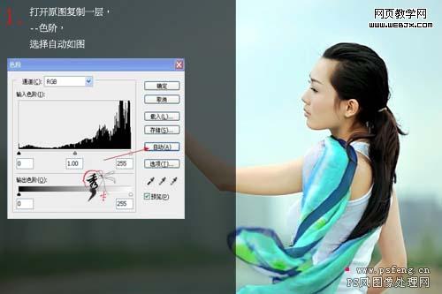 1、打開素材把背景圖層復制一層,按ctrl + l調(diào)整色階,-點擊自動如圖。
