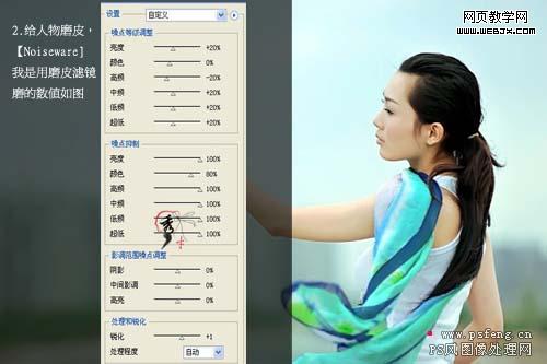 2、給人物磨皮,我直接用外掛濾色(noiseware),參數(shù)設置如下圖圖。如果沒有安裝,可以使用手工磨皮。