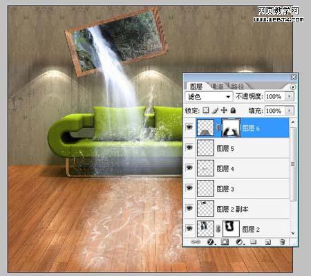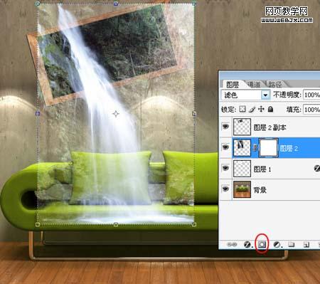 5、顯示隱藏的瀑布圖層,將圖層混合模式設為“濾色”,添加圖層蒙版。