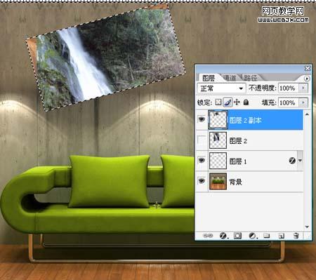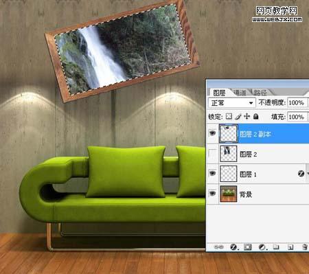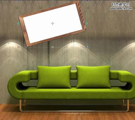 | 1、打開沙發素材,將相框素材拖入,ctrl+t調整好大小并將其傾斜。 |