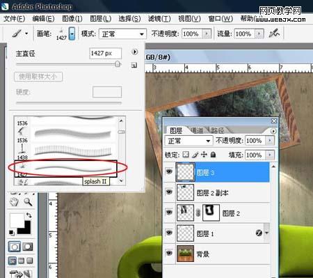 7、將前景色設為白色,新建圖層,選擇噴濺水花筆刷(可以去網上下載相關筆刷),選擇直徑為1427的筆刷,畫筆不透明度100%。