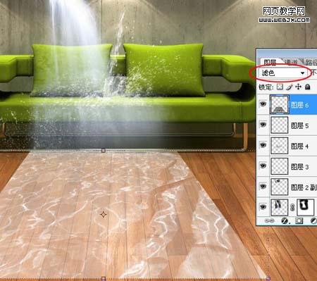 12、將水波紋素材拖入,去色,圖層混合模式設為“濾色”,ctrl+t,配合alt鍵調整好透視效果,見下圖。