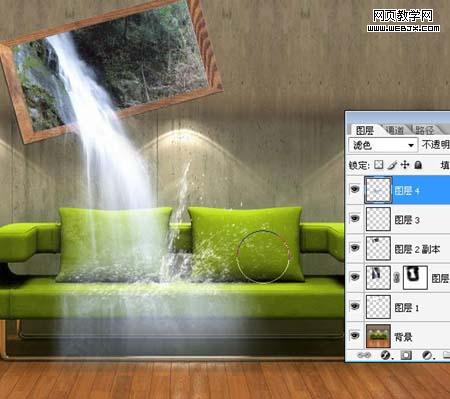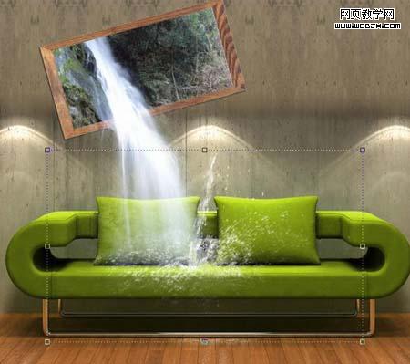 8、在沙發座墊處點擊鼠標,出現水花效果,ctrl+t調整好大小和位置。