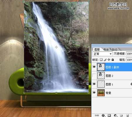 2、將瀑布素材拖入調整好大小并復制一個圖層,將其中一個圖層暫時隱藏(見下圖)。