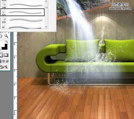 11、新建圖層,選擇531號潑濺畫筆,不透明度設為100%,在下圖左側點擊鼠標,形成水花。