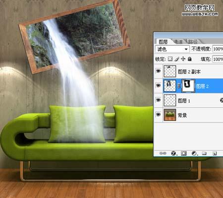 3、鼠標點一下最頂端的瀑布圖層,按住ctrl鍵,鼠標點擊相框圖層,反選,刪除,效果見下圖。