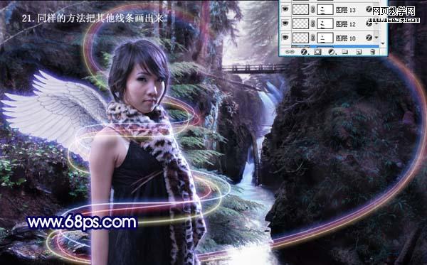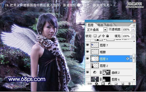 18、把美女和翅膀圖選中然后載入選區,新建圖層填充白色,添加外發光,顏色選擇淡藍色。