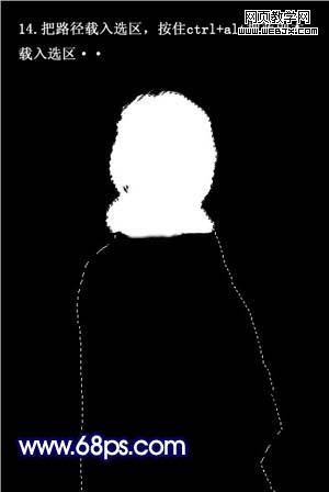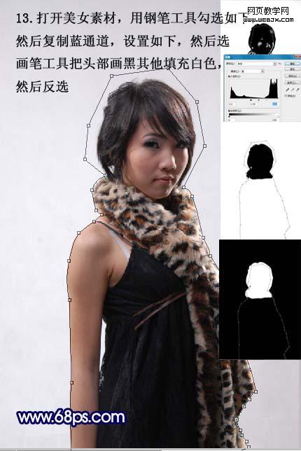 13、打開下圖所示的人物素材,用鋼筆工具勾出下圖所示路徑,然后復制藍色通道,按ctrl + l調整下色階,用畫筆把頭部畫黑,其它填充白色,按ctrl + i反選。這一步是通道摳圖,可以選擇自己拿手的摳圖方法。