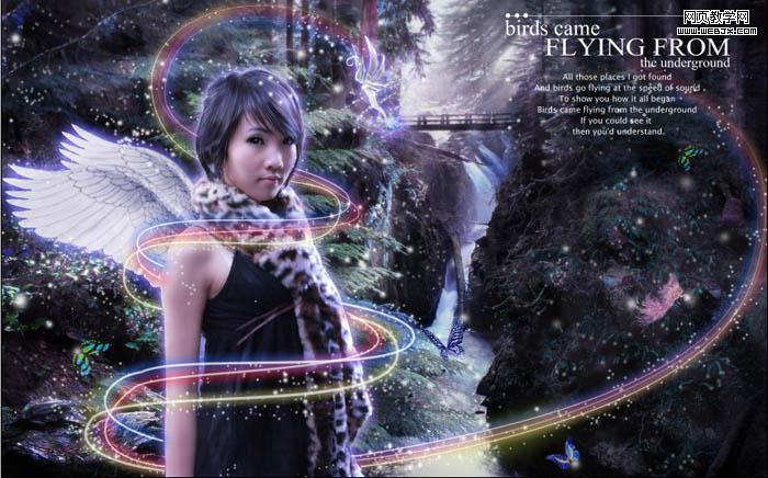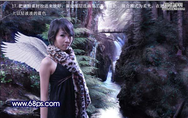 17、打開下圖所示的翅膀素材,把翅膀摳出來,復制進來放好位置,新建一個圖層,圖層混合模式改為“柔光”,然后用藍色畫筆把翅膀涂成淡淡藍色。