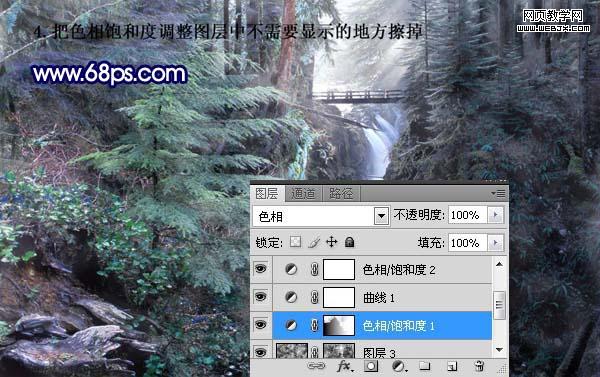 4、把色相/飽和度調整圖層中不需要顯示的地方擦掉。