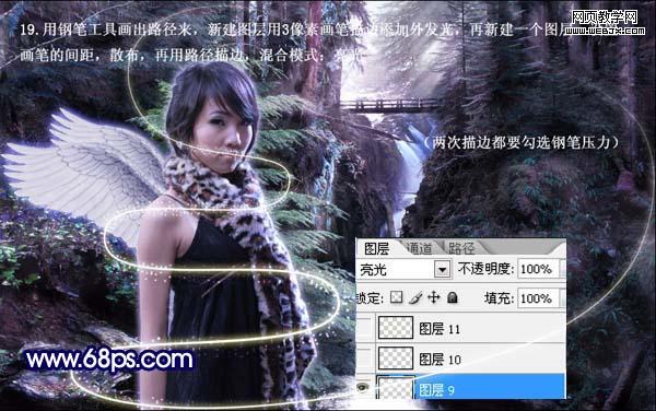 19、用鋼筆工具畫出路徑來,新建圖層用3像素畫筆描邊,添加外發光,再新建一個圖層,設置畫筆的間距,散布,再用路徑描邊,圖層混合模式改為“亮光”。