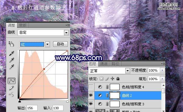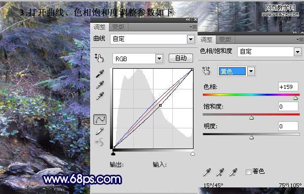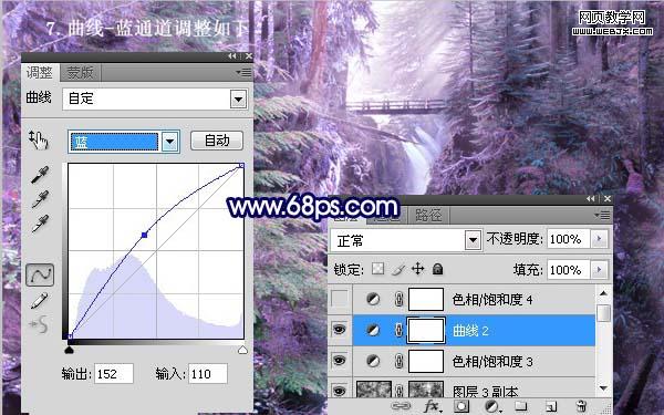 3、創建創建曲線調整圖層,對rgb及藍色進行調整,參數設置如下圖,確定后再創建色相/飽和度調整圖層,參數設置如下圖。