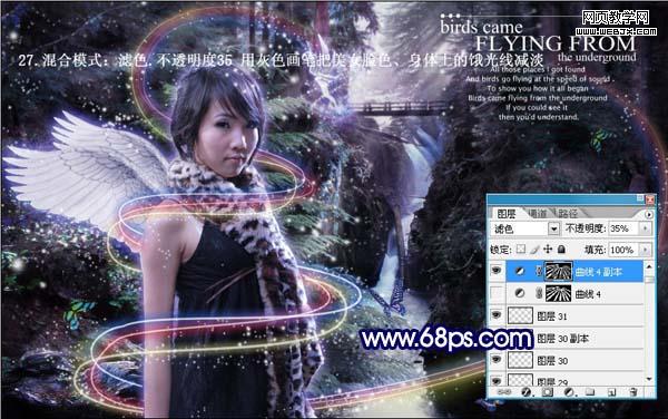 27、曲線調整圖層圖層混合模式改為“濾色”,不透明度改為:35%,用灰色畫筆把人物身體及臉部的光線擦掉。