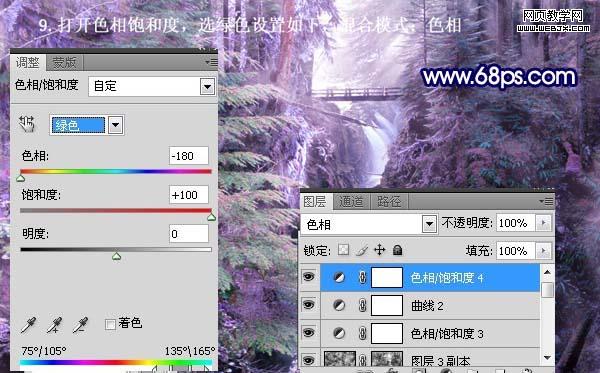 9、創建色相/飽和度調整圖層,對綠色進行調整,參數設置如下圖,確定后把圖層混合模式改為“色相”。