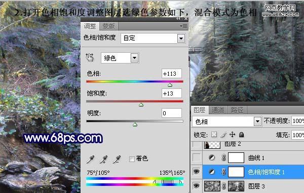 2、創建色相/飽和度調整圖層,對綠色進行調整,參數設置如下圖,確定后把圖層混合模式改為“色相”。