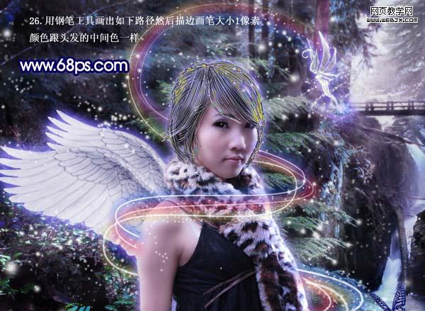 29、用鋼筆工具畫出如下路徑,然后描邊畫筆大小1像素,顏色跟頭發的中間色一樣。