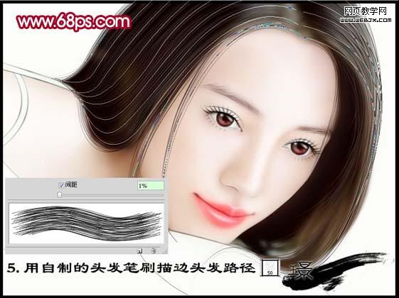 5、用自制的頭發(fā)筆刷描邊頭發(fā)路徑。頭發(fā)筆刷的定義,新建一個(gè)一個(gè)15 * 15像素的白色背景文件,選擇鉛筆工具大小為1像素,然后把前景顏色設(shè)置為黑色,點(diǎn)上一些不規(guī)則的小點(diǎn)。然后定義成畫筆即可。