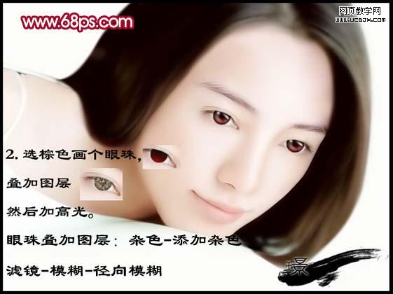 2、眼睛部分的處理:新建一個(gè)圖層,選擇棕色畫個(gè)眼珠,圖層混合模式改為“疊加”,然后加高光。對(duì)眼珠疊加圖層執(zhí)行:濾鏡 > 雜色 > 添加雜色,數(shù)值稍微小一點(diǎn),然后再執(zhí)行:濾鏡 > 模糊 > 徑向模糊。這些都是眼睛處理的常用方法,如果不太明白的可以找相關(guān)教程學(xué)習(xí)。