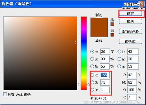 4、選擇工具箱前景色,然后彈出拾色器,設置拾色器rgb分別為224、153、16,然后單擊確定按鈕,如圖6所示。