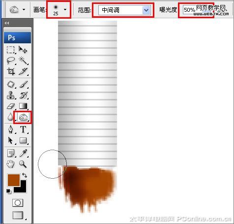 12、圖畫出煙絲的形狀,并在選擇工具箱中加深工具,在屬性欄中設置畫筆為25,范圍為中間調,并在煙絲上圖畫,