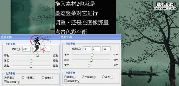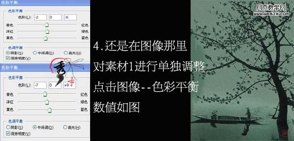 4、再對素材1調(diào)整色彩平衡(ctrl + b),參數(shù)設(shè)置如下圖。