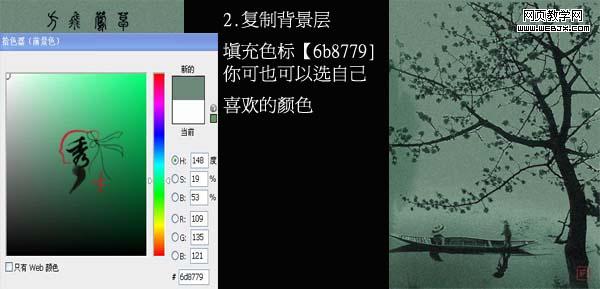 2、新建一個圖層填充顏色:#6b8779,也可以填充自己喜歡的顏色。打開素材1拖進來放好位置,圖層混合模式改為“正片疊底”。