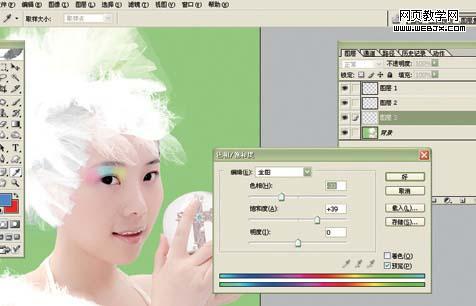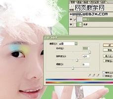 | 13、在人物眼尾處做選區(qū),羽化半徑為20 象素,復制選區(qū)圖層,執(zhí)行色相/ 飽和度,參數(shù)如下: 色相-33、飽和度+39。 |