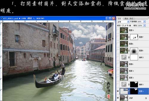 1、打開素材圖片,對天空添加云彩,適當降低云彩的不透明度。