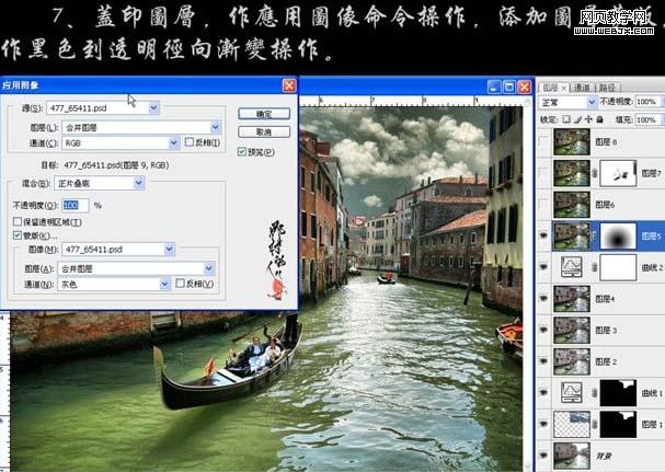 7、新建一個圖層,蓋印圖層,執行:圖像 > 應用圖像,參數設置如下圖,確定后加上圖層蒙版,用黑白漸變拉出徑向透明漸變。