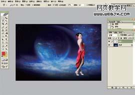 3、將人物拖入素材畫布中,適當調整好位置,并在背后穿幫的地方,用圖章工具修復好。